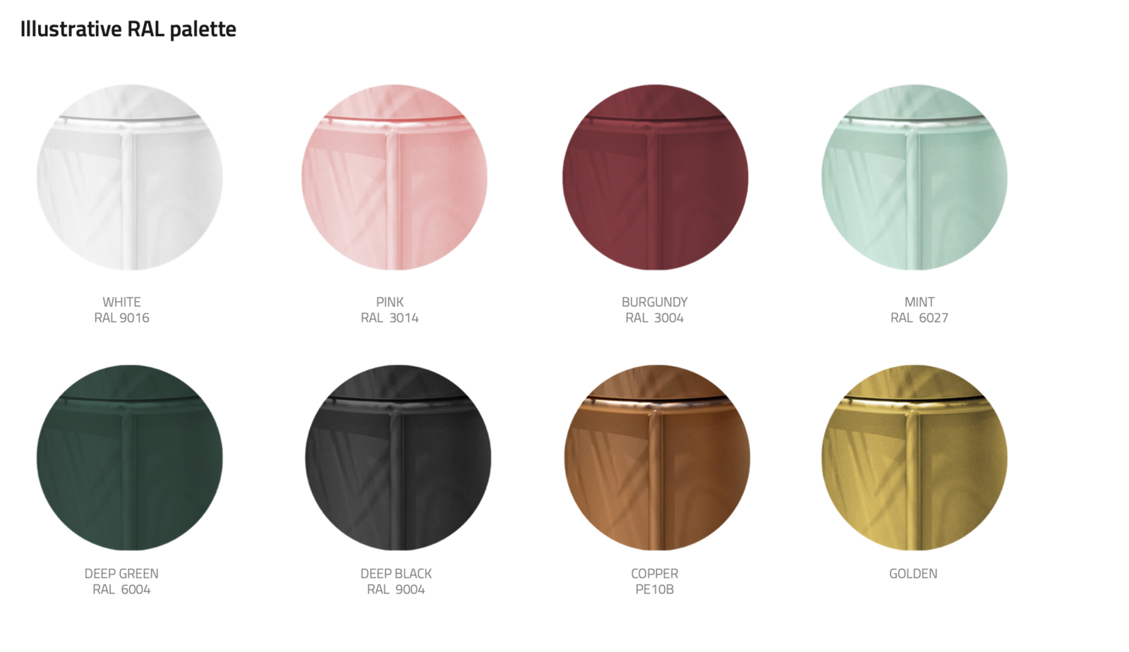 Kõik tooted on valmistatud roostevabast terasest ja pulbervärvitud. Võimalik valida erinevte toonide hulgast. Lisatasu 10 € RAL paleti eritoonidele (münt, roosa, tumeroheline, vask).