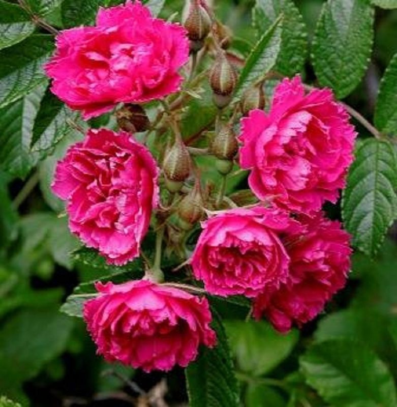 Satsilise äärega kroonlehed moodustavad karmiinpunaseid täidisõisi, mis võivad olla veidi sinakad ja mis meenutavad oma välimuselt nelgi õisi. Puhmjas põõsas, mille moodustavad väikesed ja kortsulised lehekesed. Omab palju okkaid ja harjaseid.
