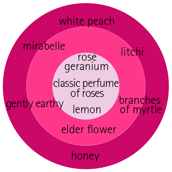 See ideaalse olemusega roos väärib erilist tähelepanu, sest lisaks oma silmatorkavale välimusele pakuvad õied (8-10cm) ka unikaalset aroomielamust. Täiuslik harmoonia, kus ühtse buketi loob erinevate lillede ja puuviljade kombinatsioon. Klassikalise roosi aroomiosana on lisatud nüanss värkset sidrunit, lõhnabuketi põhjana on kasutatud kurereha omapära. Särtsakust lisab litši. Oma osa on andnud nii leedriõied, virsik kui ka ploom. Lõhnabuketi lõplik nüanss pärineb magusa mee ja maaläheduse segust. Maksimaalne aroominauding avaldub peamiselt lõunal ning õhtuti. Teehübriidroosil on tumevioletsed õienupud, mis avanevad purpurseteks õiteks. Lehestik on tumeroheline ning kerge läikega.