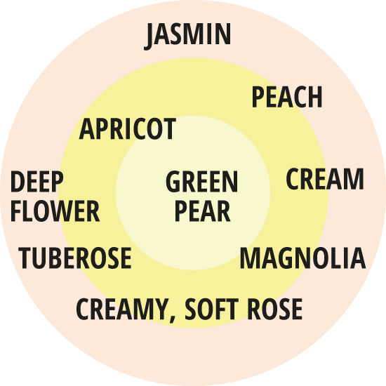 Virsiku ja aprikoosi rikkalikud lõhnad loovad sellele harmoonilisele kompositsioonile värske ja puuviljase alguse. Ühineb ka pehme ja kreemjas roosilõhn ning rohelise pirni puudutus annab selle roosi sügavale ja ümarale parfüümile meeldiva värskuse. Kohtab ka vürtsikaid külgi koos jasmiini sügavate lilleliste lõhnanootidega. Lõhna maksimaalne intensiivsus kajastub eelkõige keskpäeval ja õhtuti.