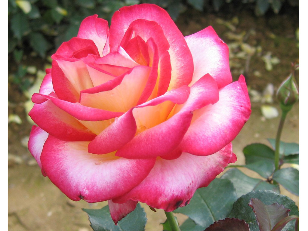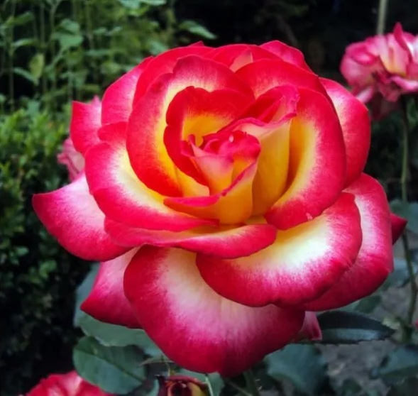 Paljuõieline roos, mis moodustab kobarates suuri 30-40 kroonlehega, 12 cm diameetriga õisi. Õied on väga atraktiivselt mitmevärvilised – südamik on valge kuldse varjundiga ja servad on tugeva karmiinpunase värvusega. Kontrast tumerohelise läikiva lehestikuga on tõeliselt ilus. Õitseb varakult kuni külmadeni. Taim on tugev ja lehestik väga terve.