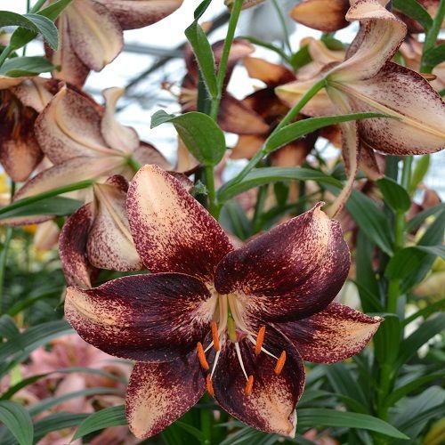 Huvitava värvi- ja mustrikombinatsiooniga aasia hübriid. Harvaesinev purpurse järelvarjundiga pruunikas seguneb omapärasel kombel aprikoosikarva beežiga. Tolmukad erkoranžid. Suured kuni 12 cm õied on lõhnatud.