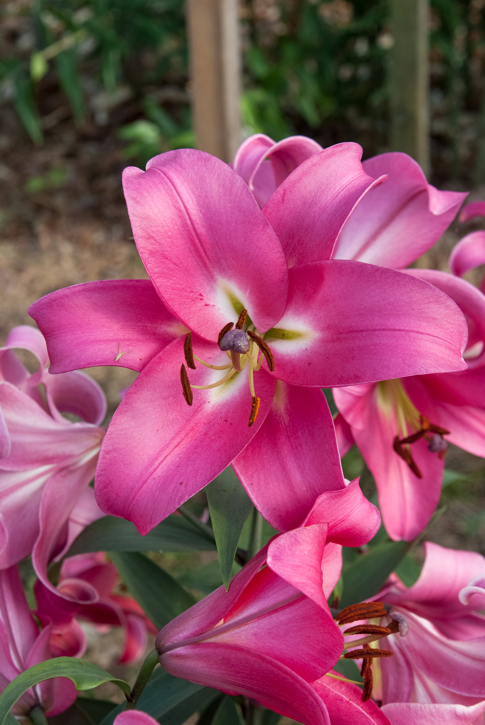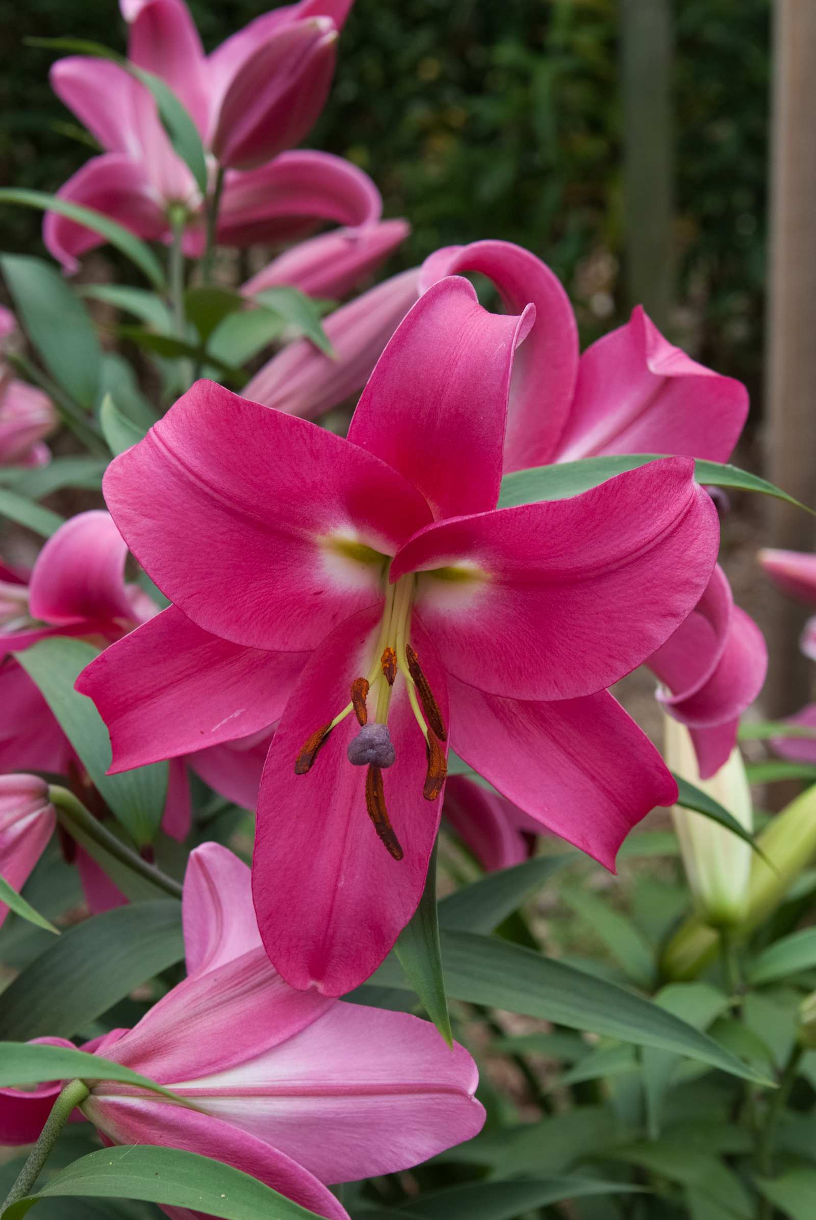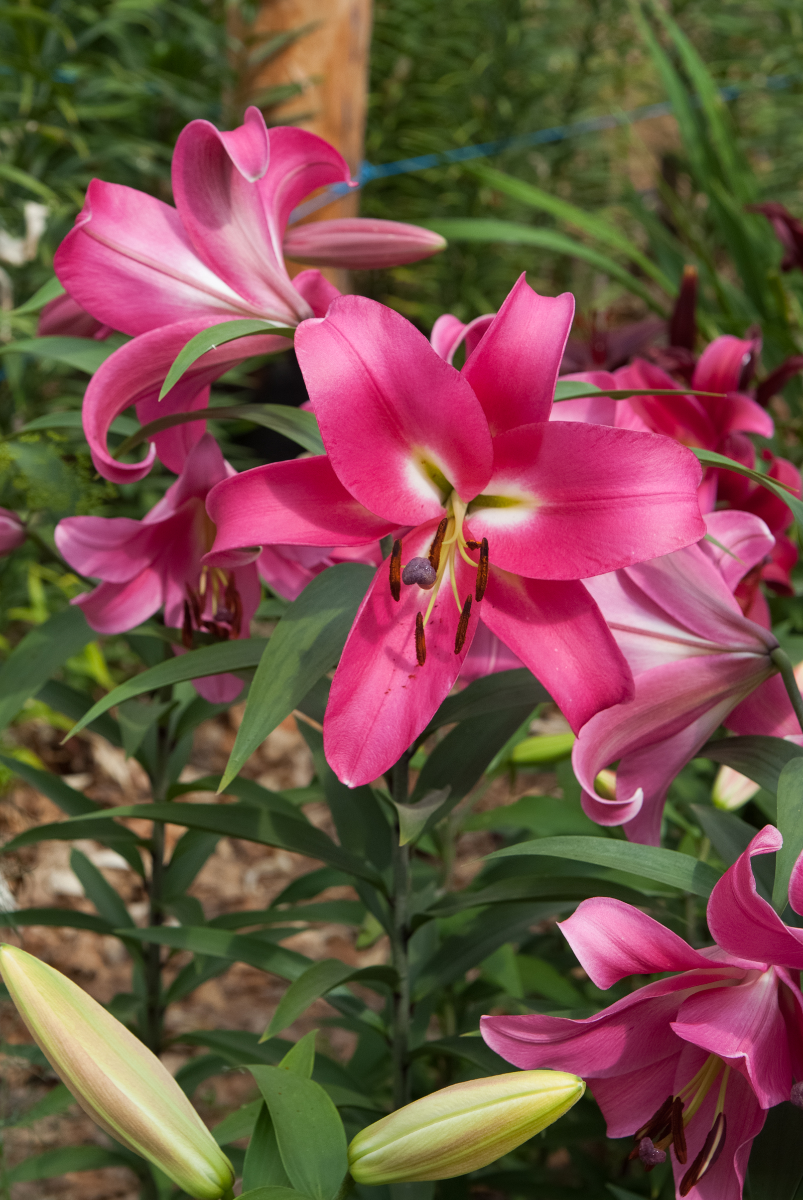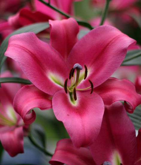 Kaunid suured õied on vaarikaroosad, kroonlehed elegantselt üles keerdunud.