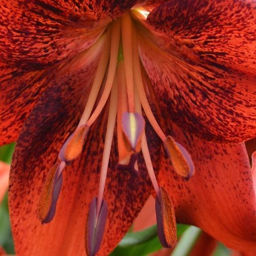 Säravad õied on tumepunaste kroonlehetedega, mis südamiku ümbert kaunilt tähnilised. Tolmukad oranži ja purpursega. Aasia liilia suured lõhnatud õied on kaunilt küljele vaatavad.