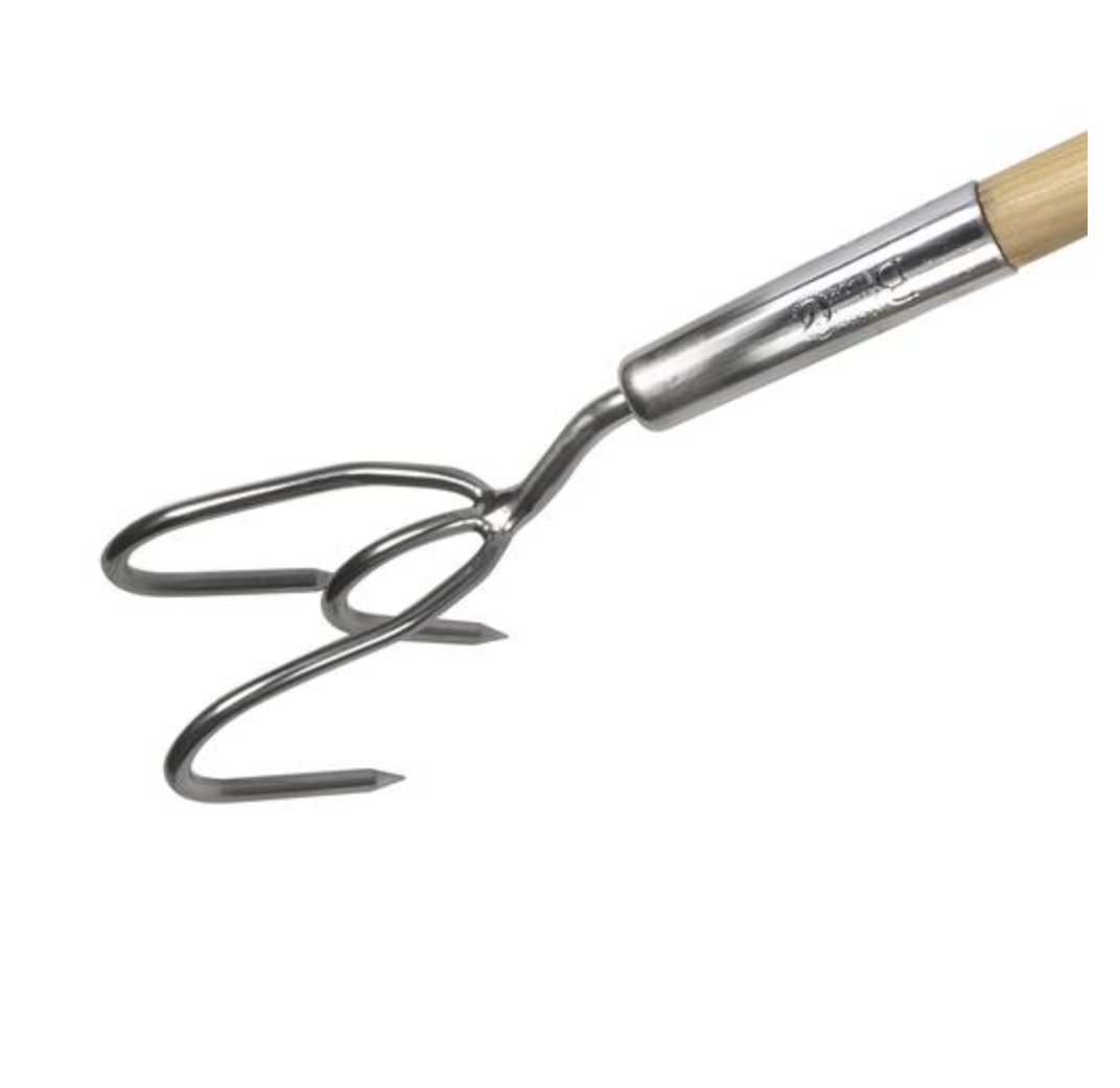 Roostevaba käpp mulla õhutamiseks ja peenarde ettevalmistamiseks. Terasest pea ei roosteta ning pikk kerge puitkäepide on valmistatud taastuvallikatest pärit FSC puidust.  Riputamiseks on nahkpaelast aasake.