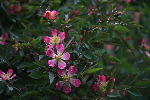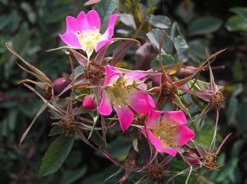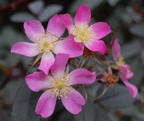 Punalehine kibuvits. Ühekordsed, roosad lihtõied, valge keskme ja kuldsete tolmukatega. Moodustab sügiseks ovaalsed, oranžikaspunased viljad. Lehed dekoratiivsed hallikaspurpursed, nõtked võrsed kaarduvad kergelt õiemassi all.